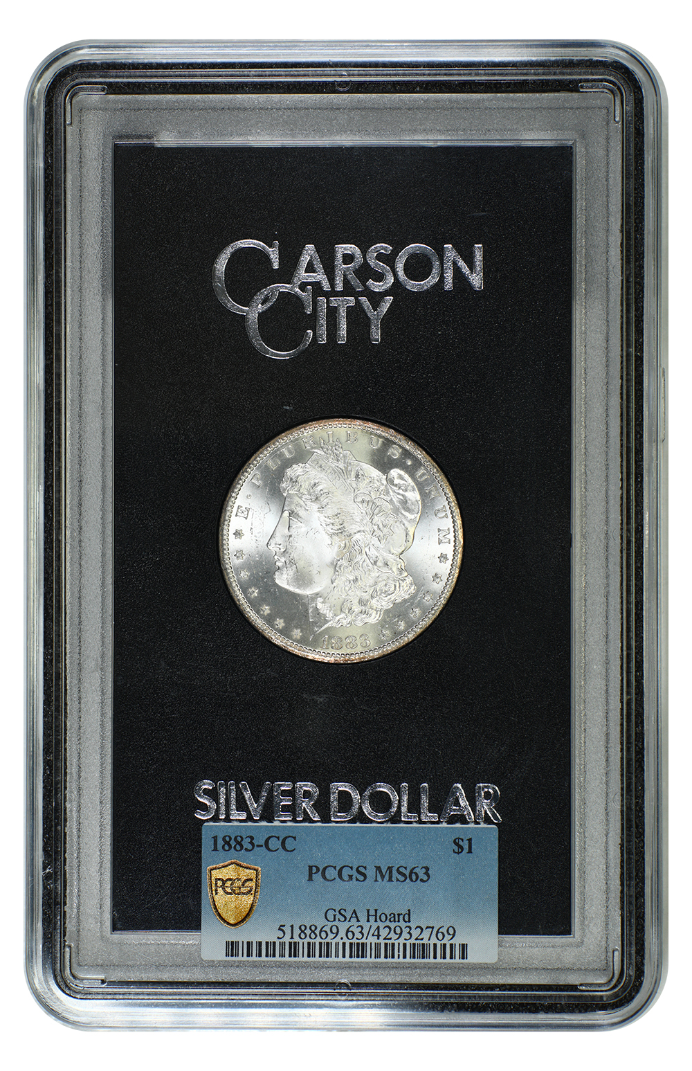 The 1883-CC GSA Morgan dollar is among the most common of GSA Hoard coins, with 755,518 released in the legendary sale out of a total mintage of 1,204,000. These examples include circulated and uncirculated coins as well as examples in hard packs or soft packs. While all GSA dollars are considered scarce and desirable as a category, there is extra consideration given by collectors to pieces that are still in their original GSA packaging. Even the major grading firms such as PCGS and NGC will grade these coins intact in their original government packaging. PL and DMPL examples in GSA packaging are desirable.
